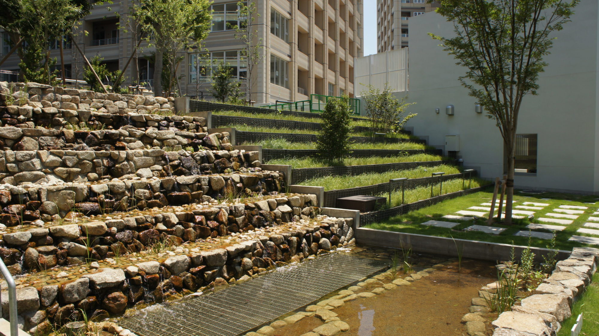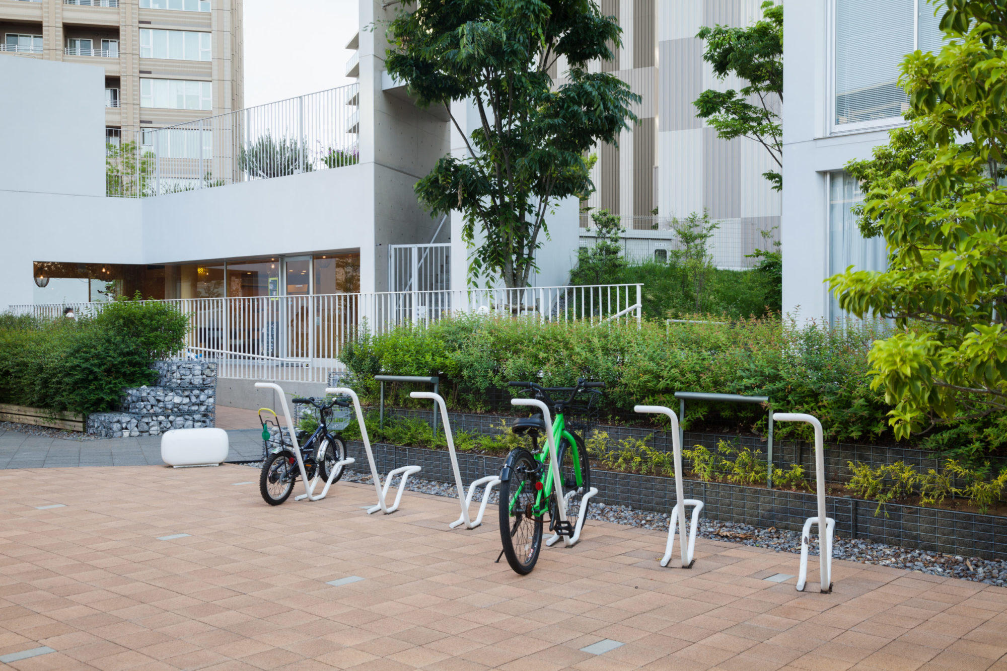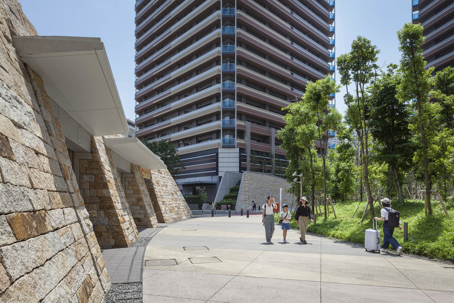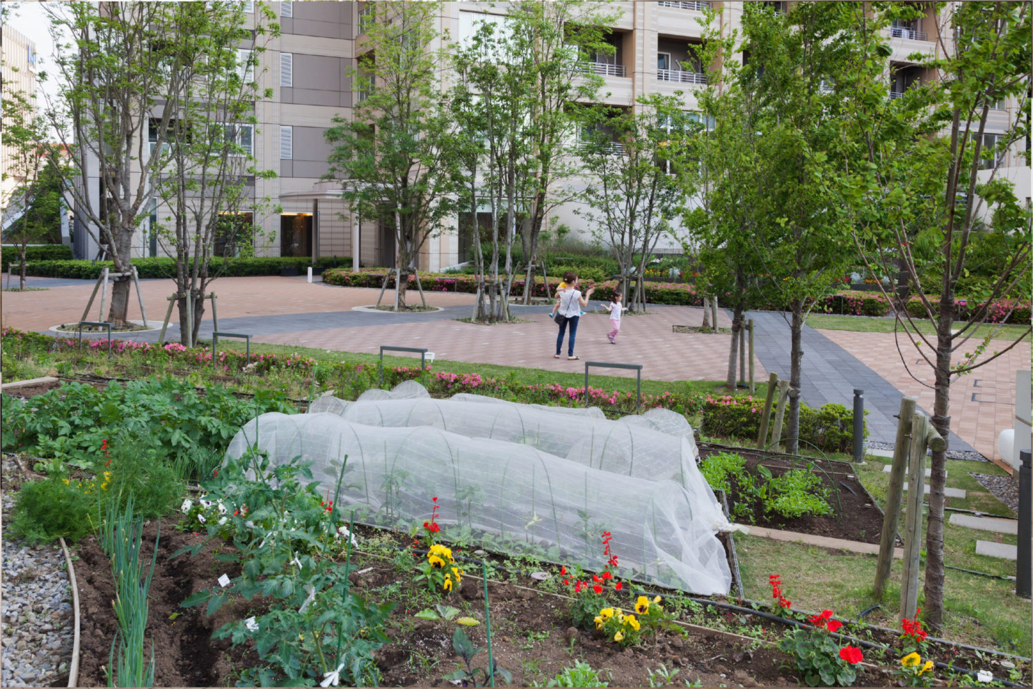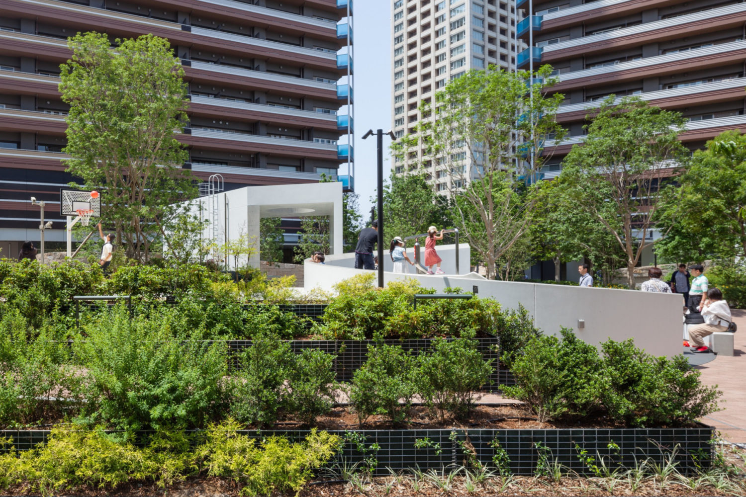 レジデンスエリアでは、住宅棟に囲まれたグリーンアクシスを縦横に貫く「緑段」が展開されている。段状構造により緑量を立体的に確保し、人々が自然と緑豊かな空間を認識できるようデザインした。緑段は単なる植栽帯に留まらず、前庭や庭園、菜園、自由花壇として住民の手によって日常的に利用されることで、「生活景」を生む装置となっている。また、段差を利用してテラス席やビオトープカスケード、遊具、アート展示の舞台としても活用され、都市の軸線に偶発性と滞留の機会をもたらしている。