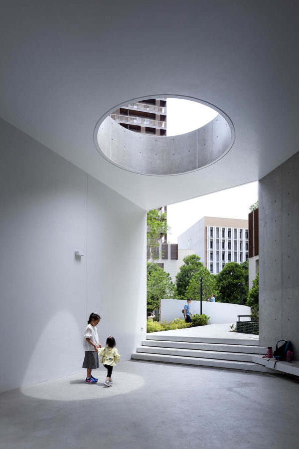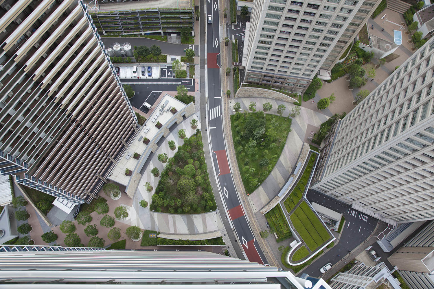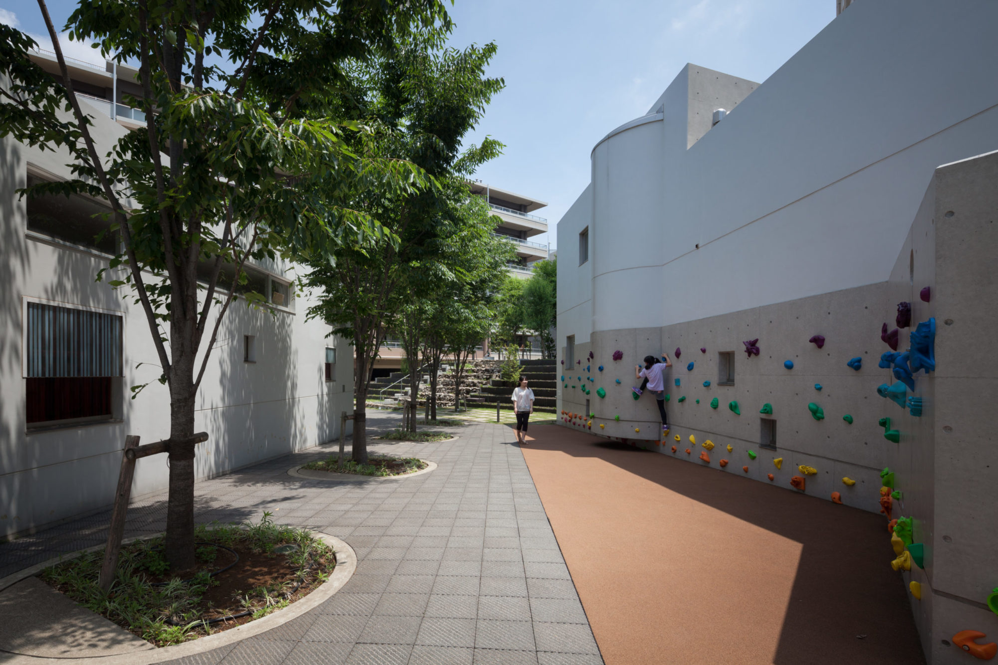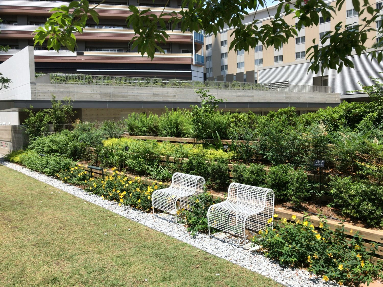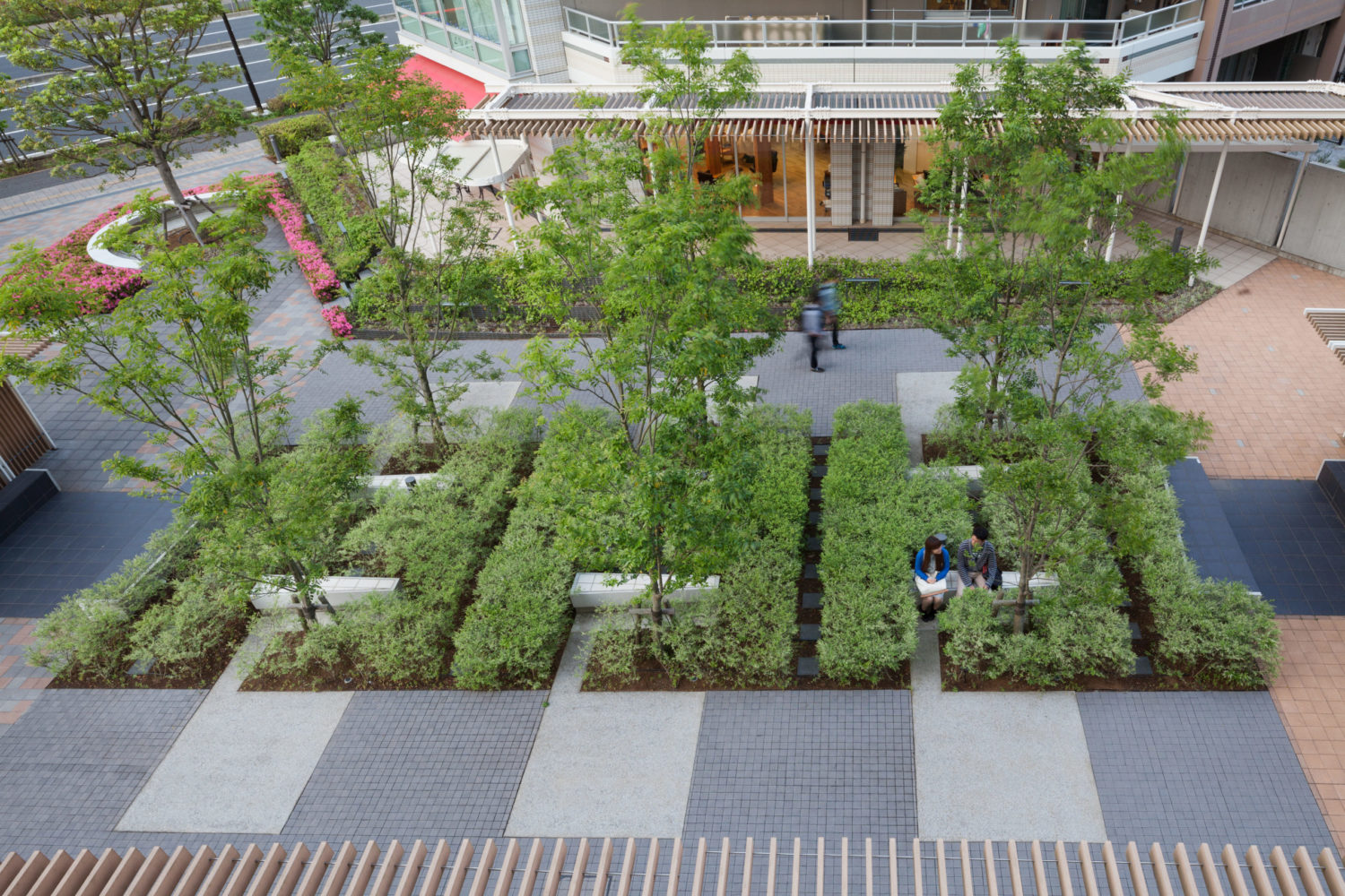 レジデンスエリアでは、住宅棟に囲まれたグリーンアクシスを縦横に貫く「緑段」が展開されている。段状構造により緑量を立体的に確保し、人々が自然と緑豊かな空間を認識できるようデザインした。緑段は単なる植栽帯に留まらず、前庭や庭園、菜園、自由花壇として住民の手によって日常的に利用されることで、「生活景」を生む装置となっている。また、段差を利用してテラス席やビオトープカスケード、遊具、アート展示の舞台としても活用され、都市の軸線に偶発性と滞留の機会をもたらしている。