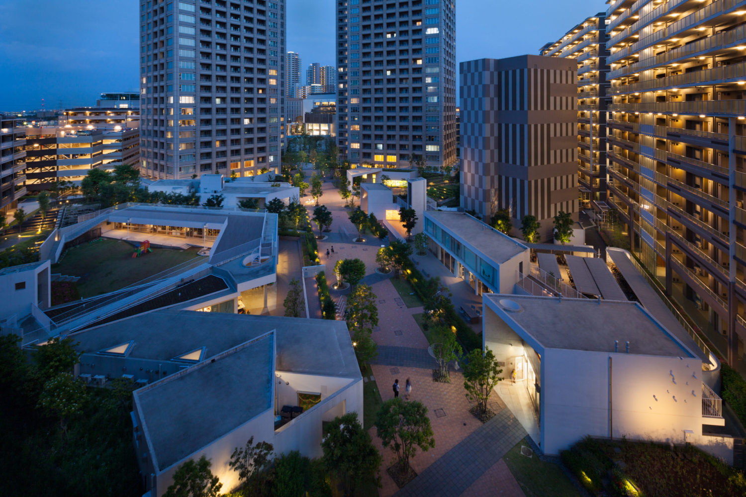 計画の中心には、「幾何学的な都市の秩序」と「ヒューマンスケールの偶発性」の共存という考え方がある。西口駅前からこんぶくろ池公園へと伸びる強い軸線となるグリーンアクシスには、小広場を連ねる横断的な列植を重ね、歩行者が立ち止まり、佇み、交流するための余白が生み出された。また、住宅区や公共空間の周辺では、個々の前庭や菜園の連続を意識した「パブリックとプライベートの集積」として人のスケールで、歩いて楽しい空間を編み上げる手法を導入。エリアデザイン会議のもと、UDCKを中心とした公・民・学の多様な専門家による議論を通じて、増築的・段階的に生まれるまちの断片をつなぎ合わせ、統一感と多様性を両立させる都市風景が形成されている。