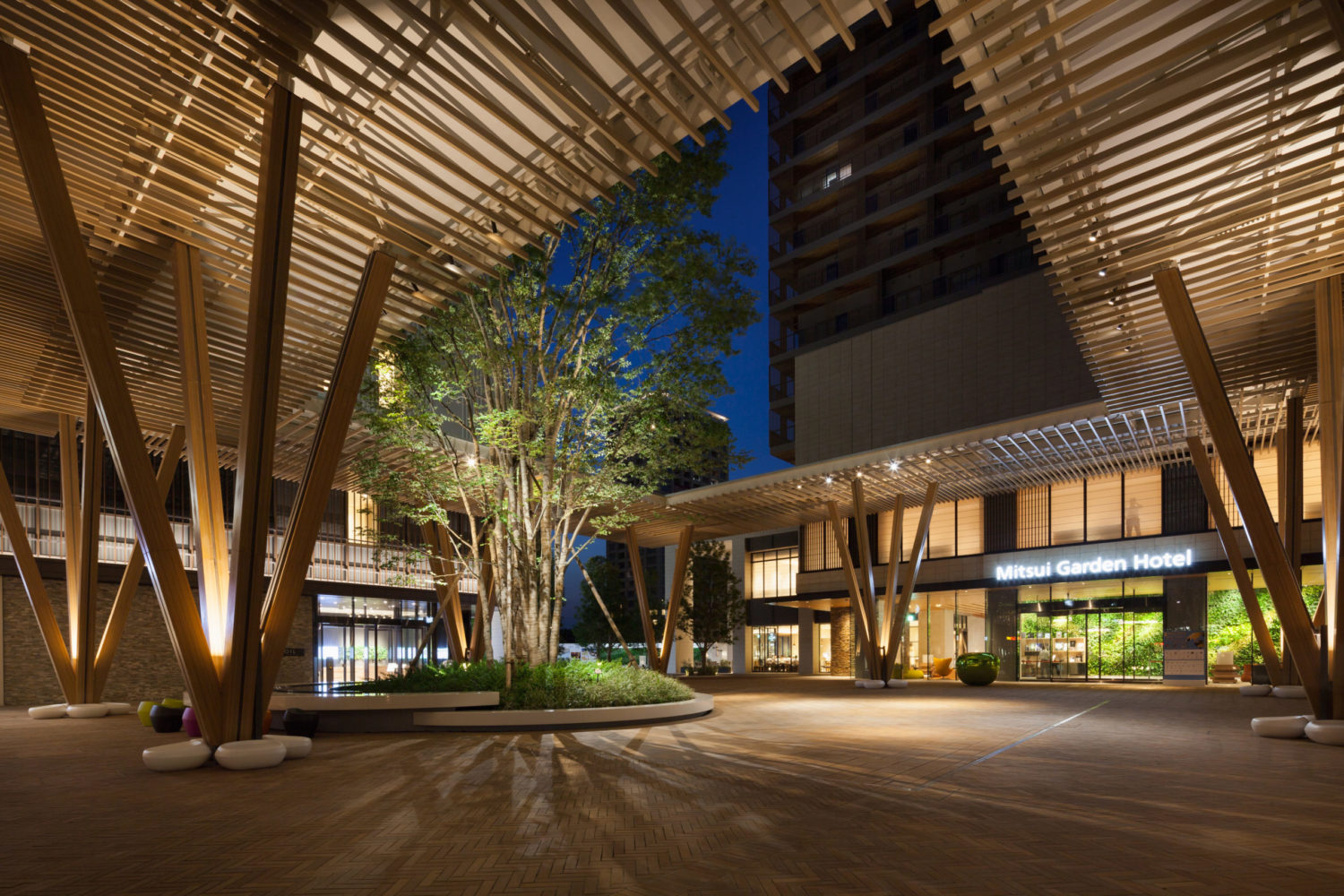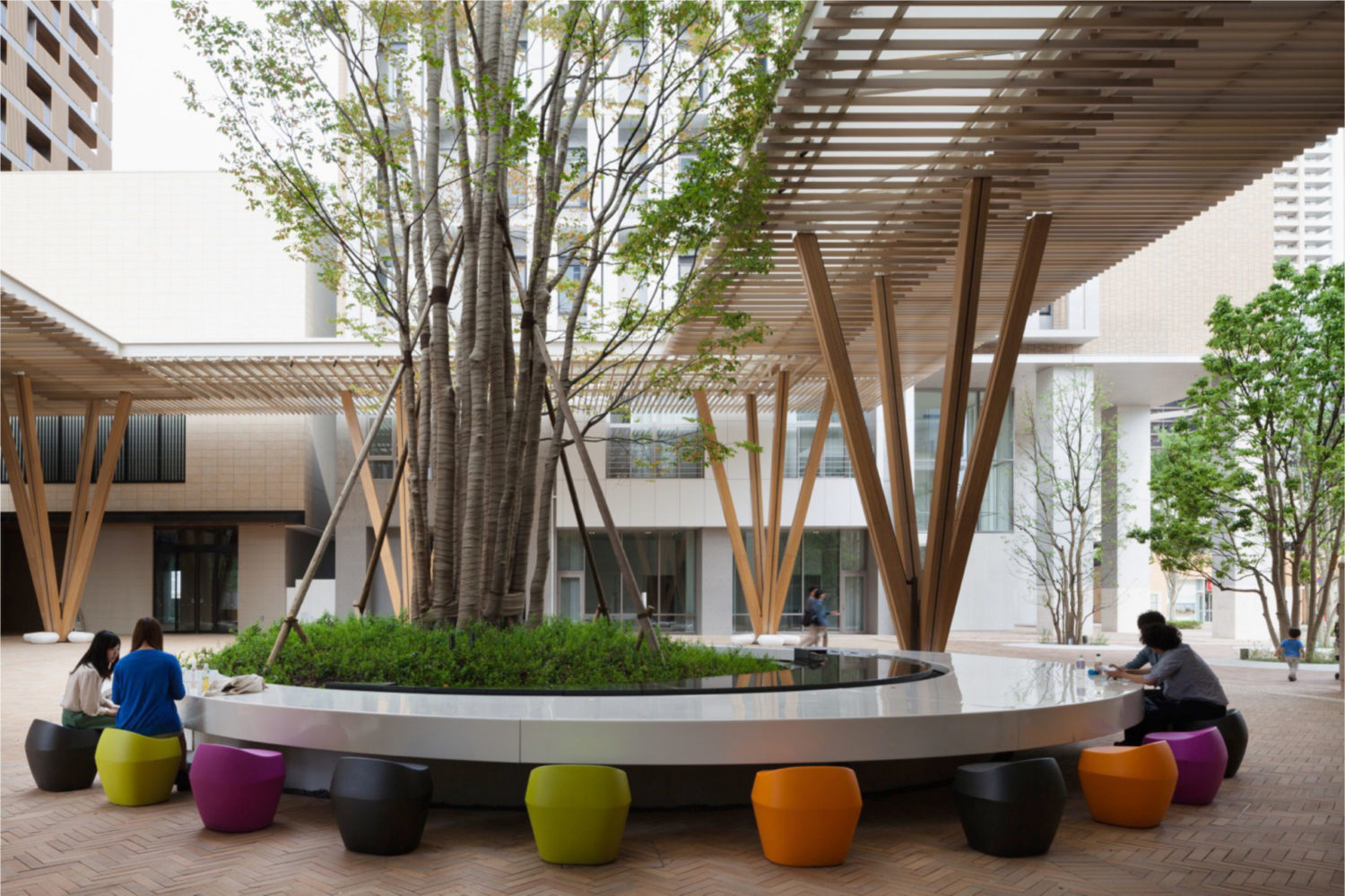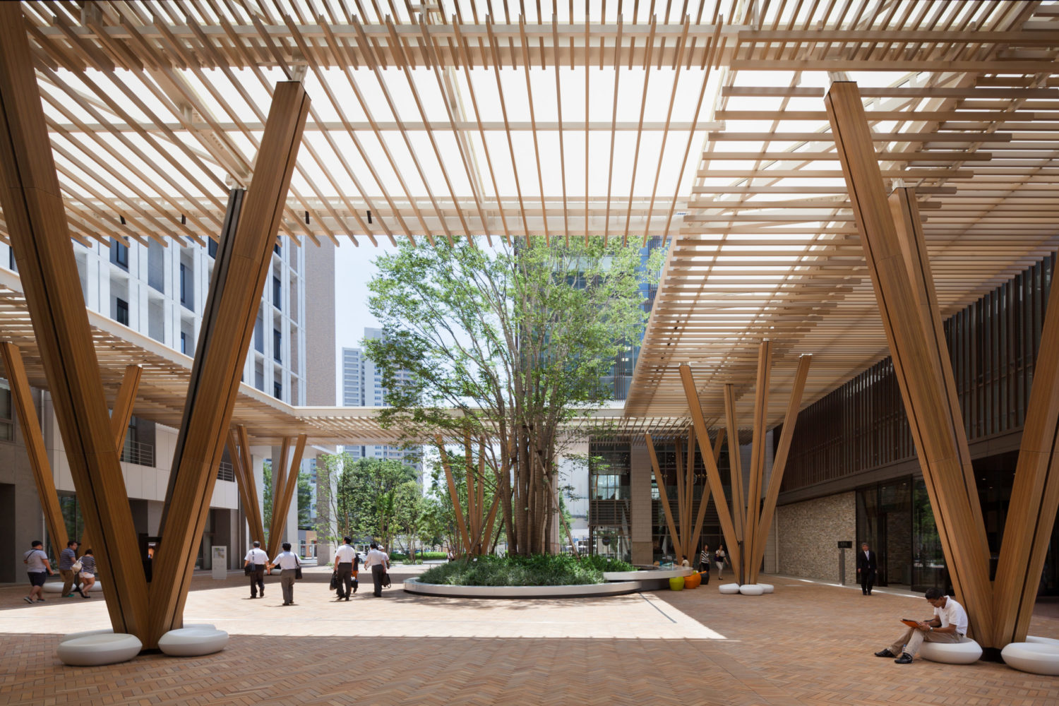 駅前に広がるプラザは、駅利用者を迎える玄関口であると同時に、隣接するホテルや商業施設のエントランスと連続する、まちの顔となる広場である。プラザのシンボルツリーである巨大なケヤキは、周辺の建築・高架鉄道のスケールをやわらげながら、都市の喧騒を受け止める「緑の大屋根」として機能している。