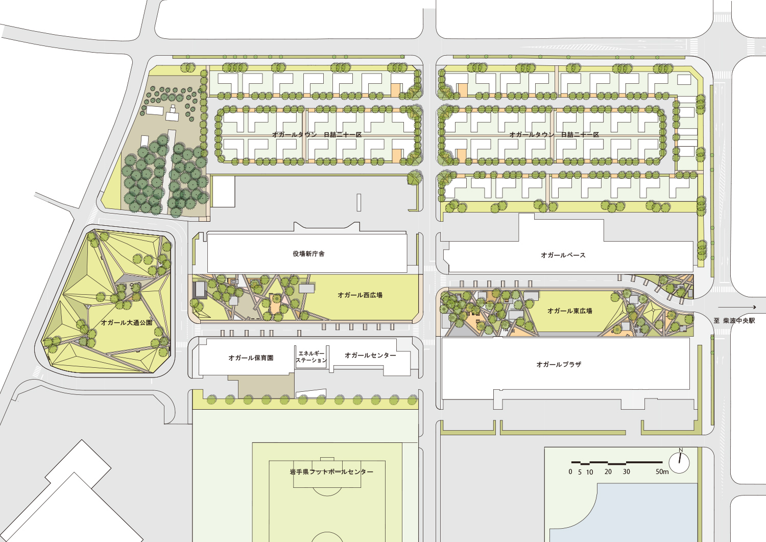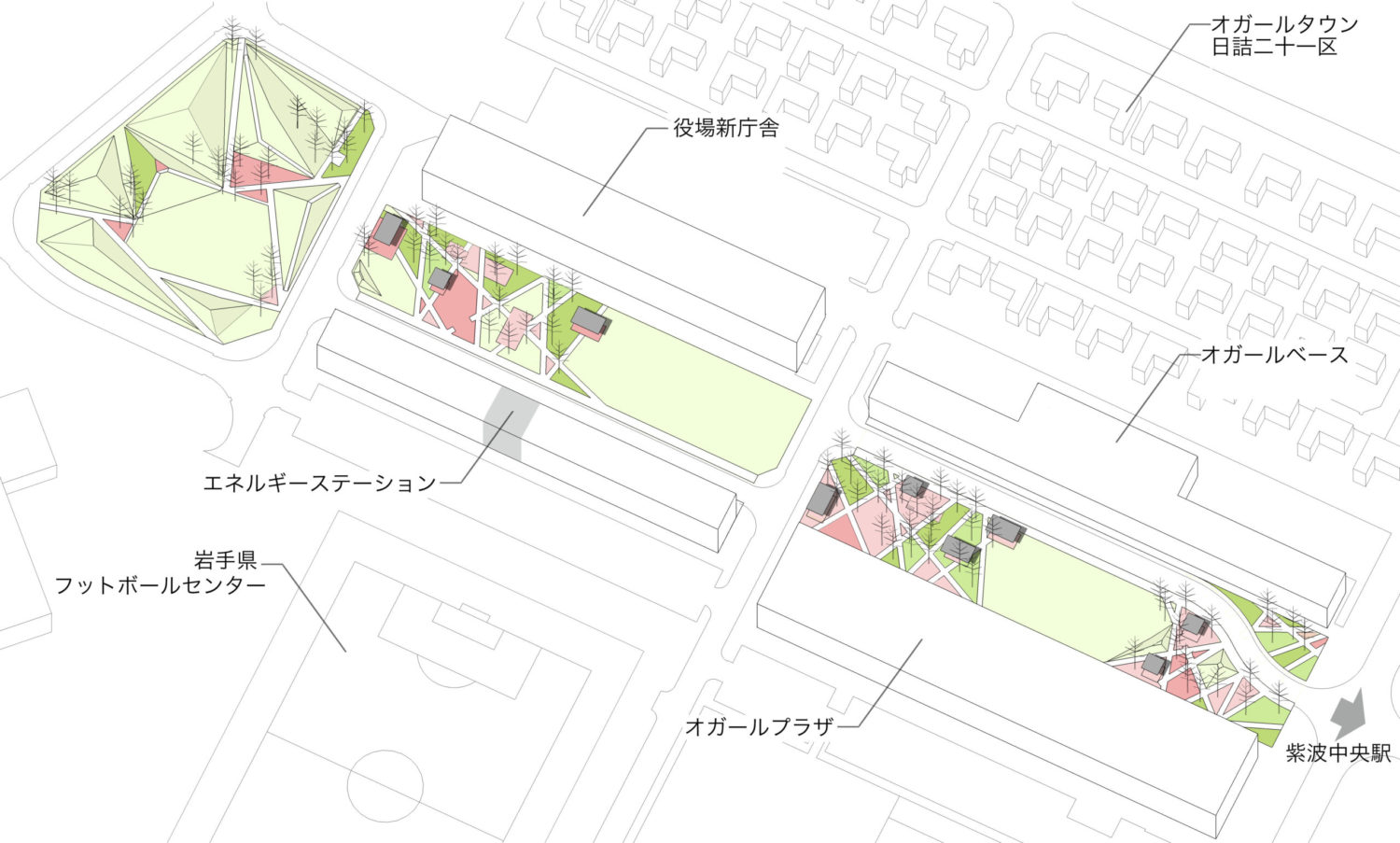 オガールプロジェクトは、駅前の休眠地10.7haを活用し、2005年から公民連携で進められてきた複合開発である。岩手県の中央部に位置する紫波中央駅前にあり、西側は散居村のある豊かな田園風景が広がる。オガール広場は敷地の中央に位置し、幅約30m・長さ約350mの細長い形状で、エリア全体を貫く象徴的な軸として機能している。この軸に沿って配置されたオガールプラザやオガールベースには、商業、スポーツ、宿泊などの民間機能と、図書館や子育て支援施設といった公共サービスが共存し、地域住民と来訪者の交流を支える多様な活動拠点が連なっている。