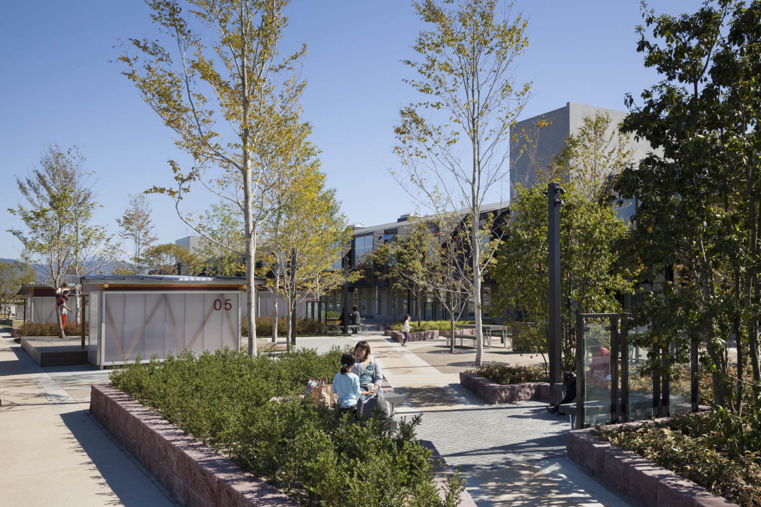 広場は、施設群をつなぎ合わせる大きな中庭として機能し、周囲の建物がもつ役割を補完しながら、屋内では得られない体験を生み出す空間となっている。まちのえぐねに張り巡らされた小道は、自由な回遊と偶然の出会いを誘い、木立のなかのスタジオは暑い日射しや雨風を避けつつ、屋外での気軽な集まりや学びを行える拠点となる。